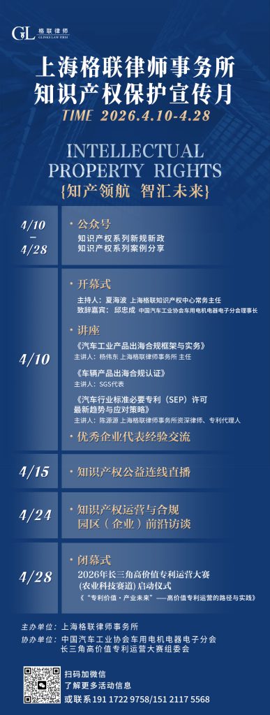 在第26个世界知识产权日来临之际,上海格联律师事务所知识产权保护宣传月如约而至。今年,我们将以 “知产领航 智汇未来” 为主题,聚焦汽车产业出海合规、标准必要专利、高价值专利运营等行业热点,通过专题讲座、公益直播、前沿访谈、赛事启动等多元形式,为企业创新与知产保护提供实务指引。